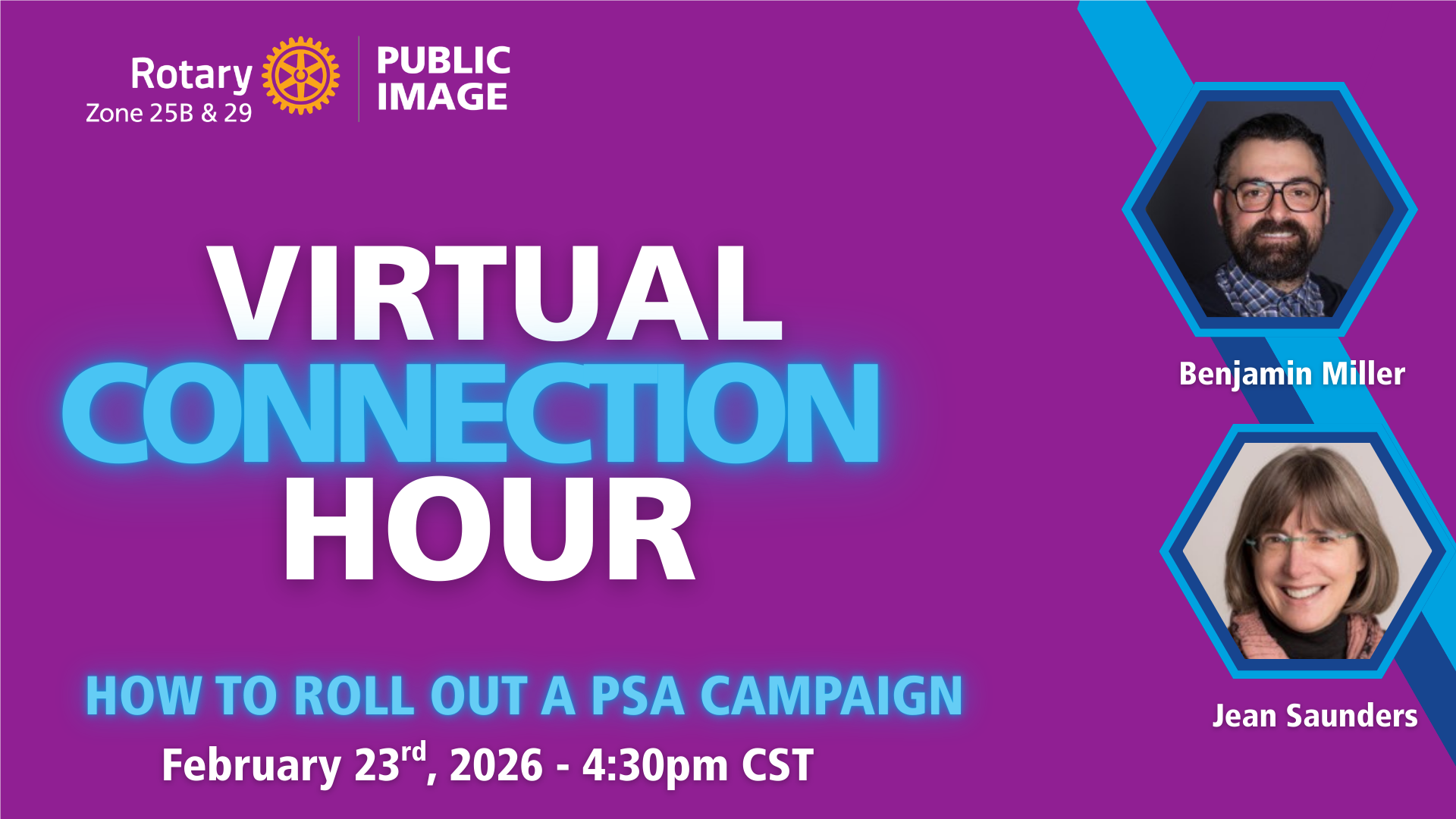 Did you miss the February Virtual Connection Hour?![]() On February 23rd, we shared how to successfully roll out a Public Service Announcement (PSA) campaign using Rotary International’s ready-to-use tools and resources. These materials are designed to help your club elevate its public image and expand your reach in your community. If you weren’t able to join us live — or want to revisit the content — click here to watch the recording and access the resources: https://zones25b-29.org/sitepage/public-image-resource-library |