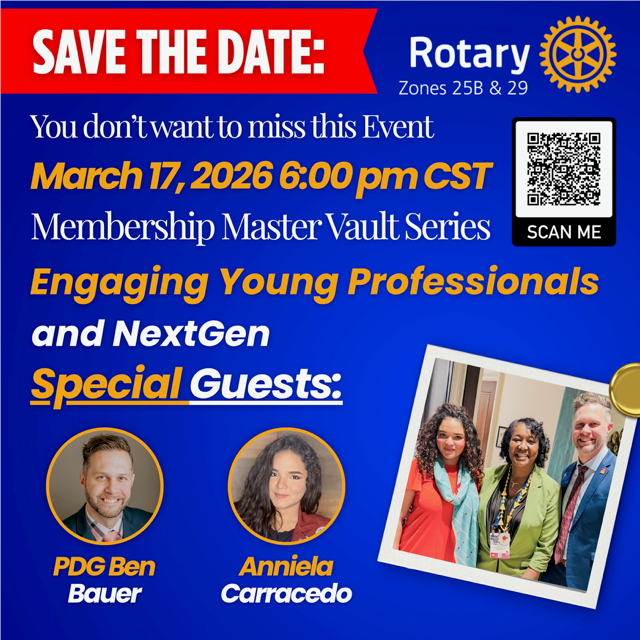 March Membership Vault Series![]() Mark your calendars for Tuesday, March 17th for the March Membership Master Vault Series webinar - Engaging Young Professionals! We are honored to host special guests from our 2026 International Assembly plenary stage Rotaract Leader Anniela Carracedo and PDG Ben Bauer. This series will be focused on our ability to attract young professionals and ignite membership to growth. Scan the QR code to register!