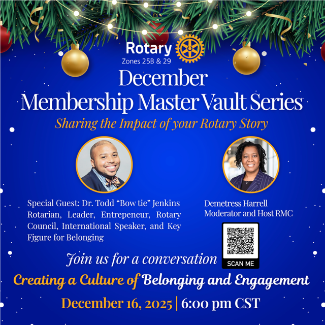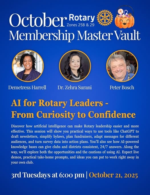 Join us Tuesday, 10/21 at 6 PM for the Rotary Membership Master Vault![]() We kindly ask that you register and share this opportunity with your members in your clubs. Please encourage them to register, as one-time registration provides access to ALL sessions for the Rotary year. Click to Register |